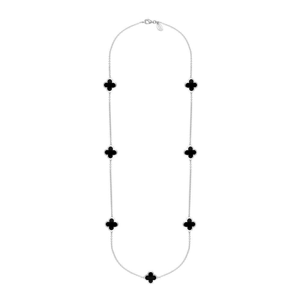 9ct White Gold Whitby Jet Bloom Four Leaf Clover Long Necklace