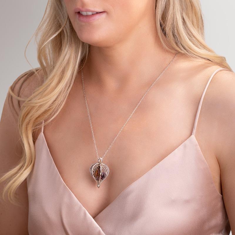 This beautiful necklace is part of Rebecca Sellors' Flore collection. The pendant is formed of sterling silver petals with intricate filigree detailing. In the centre is a hand carved and polished Blue John gemstone. The pendant hangs gracefully from a sterling silver chain which fastens with a classic bolt ring style clasp.