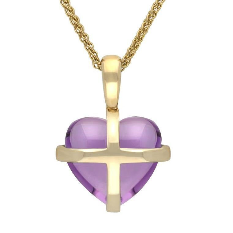 This elegant necklace is part of our Cross Heart collection. It features a small sized hand carved heart shaped Amethyst gemstone. The individual highly polished Amethyst has been framed within a 9ct yellow gold mount that embraces the gemstone in a cross design. It sits gracefully on a 18" 9ct yellow gold chain completed by a classic bolt ring clasp for easy wear.