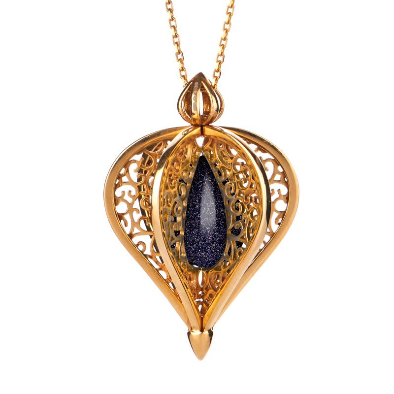Yellow Gold Plated Sterling Silver Blue Goldstone Flore Filigree Droplet Necklace