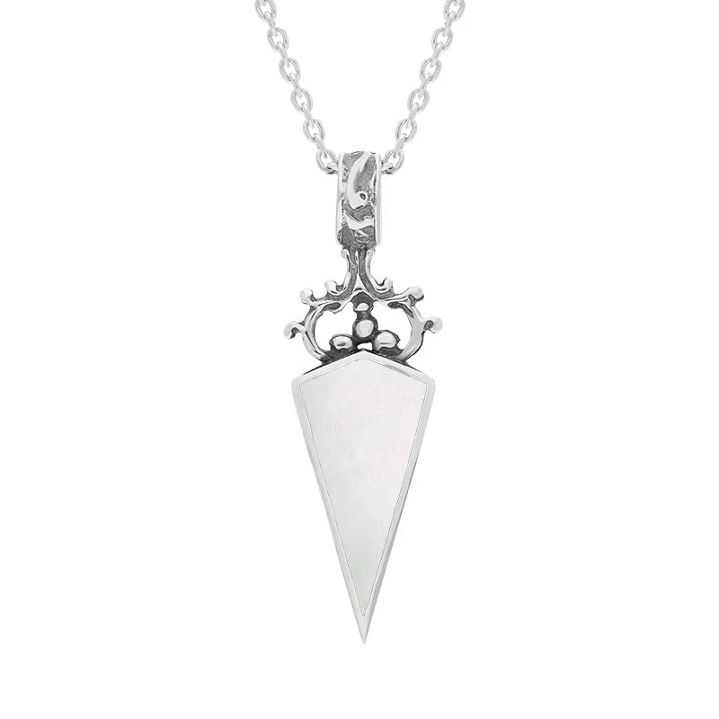 This classic double sided fob necklace is part of our Heritage handmade jewellery collection and features a dagger shaped locally sourced Whitby Jet gemstone on one side and a White Mother Of Pearl gemstone on the other. The stones are framed within a heavy highly polished Sterling Silver setting with a scroll shaped bail. This item is complete with an 18 inch Sterling Silver chain.