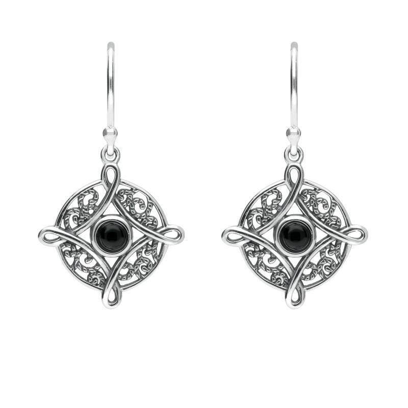 These exquisite earrings feature two stunning circular shaped cabochons of the finest Whitby Jet stone, sourced directly from the north east coast of Yorkshire. The stones are framed by a sterling silver Celtic-style cross and a delicate filigree rope design for an exquisite finish. The ornate sterling silver earrings are perfect for everyday wear and are easily secured with hook fastenings.