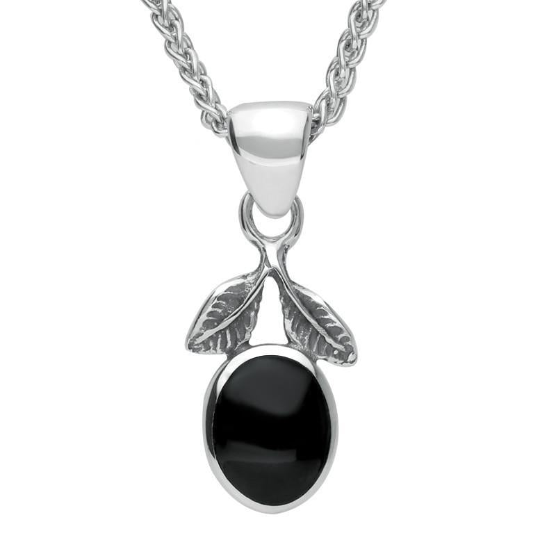 This finely crafted pendant features an oval stone of whitby jet, set into an elegant Sterling Silver leaf stem design. The pendant hangs gracefully from an 18 inch sterling silver chain, offering a design which looks perfect on any occasion.