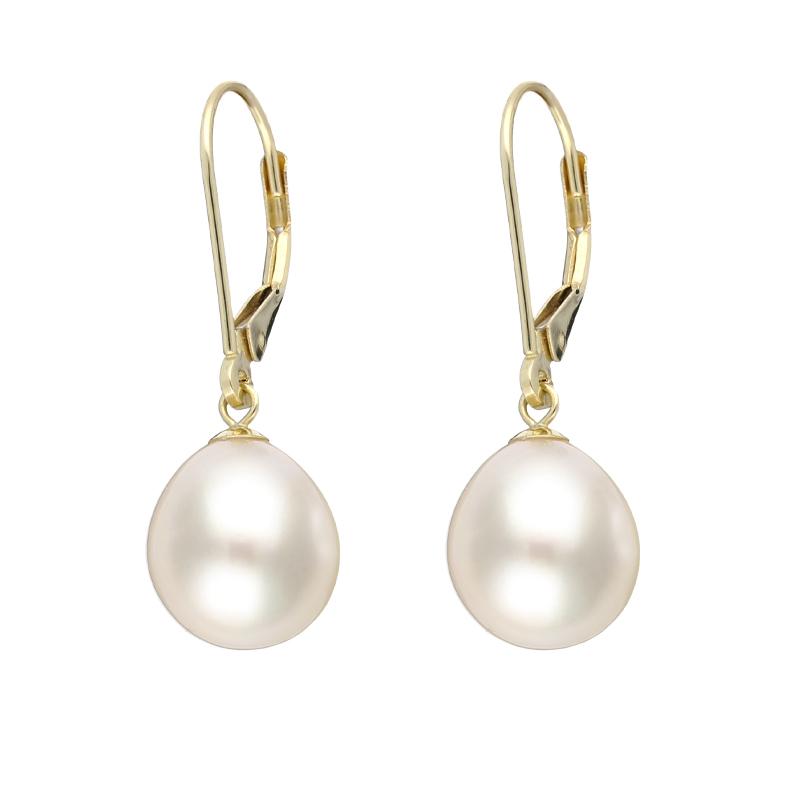 18ct Yellow Gold White Pearl 9mm Lever Back Drop Earrings, E2518.