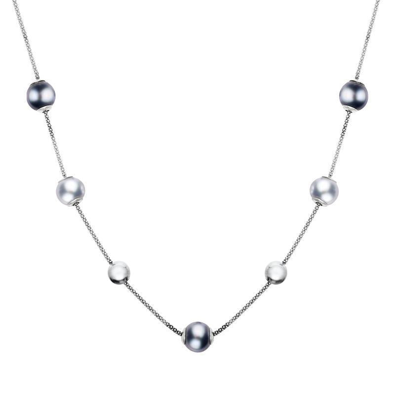 This striking and sophisticated necklace boasts five unmissable fine pearls in grey and black. The pearls hang from a mesmerising sterling silver chain with two sterling silver beads for extra detailing. The necklace is completed by a classic bolt ring clasp for easy wear.