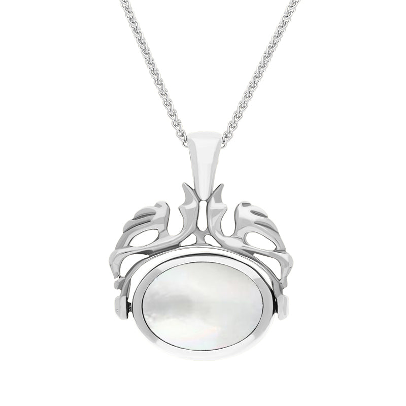 9ct White Gold Whitby Jet Mother Of Pearl Double Sided Oval Swivel Fob Necklace