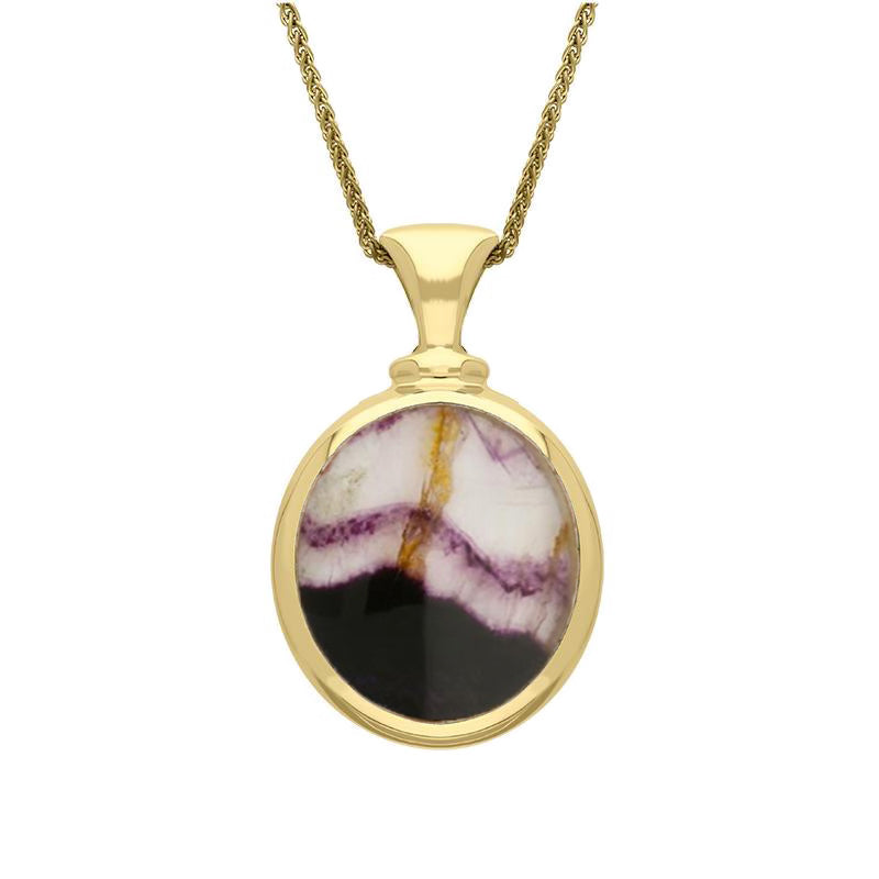 This beautiful double sided fob style necklace features the finest Blue John and White Mother Of Pearl. The hand carved gemstones are flush set into the organic, contemporary oval shape giving a smooth and highly polished finish. Sold complete with an 18 inch 9ct yellow gold chain which fastens with a classic bolt ring style clasp. Dimensions: 18mm x 15mm.
