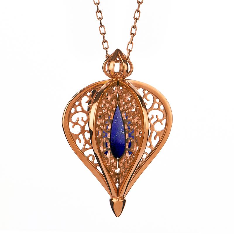 This beautiful necklace is part of Rebecca Sellors' Flore collection. The pendant is formed of rose gold plated sterling silver petals with intricate filigree detailing. In the centre is a hand carved and polished Lapis Lazuli. The pendant hangs gracefully from a rose gold plated sterling silver chain which fastens with a classic bolt ring style clasp.