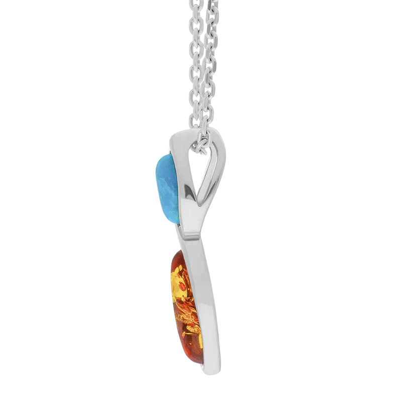 This versatile necklace features genuine Turquoise and Amber framed in Sterling Silver. This feminine necklace is perfect for everyday wear and is presented on an 18'' long Sterling Silver chain with a classic lobster clasp for easy wear.