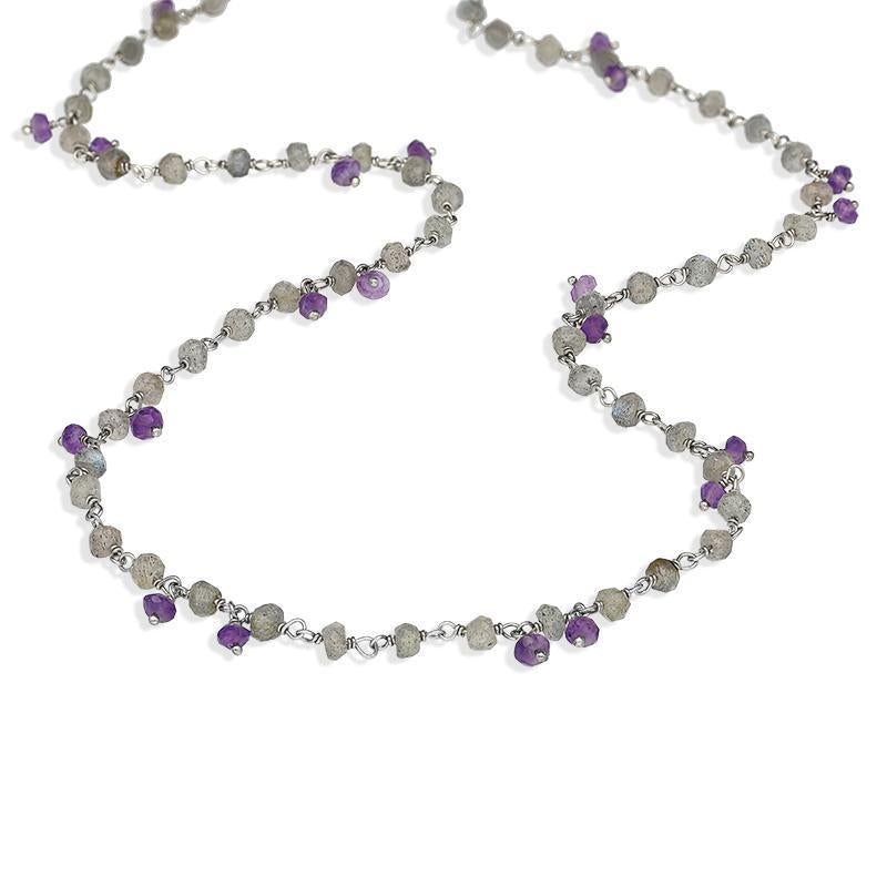 This Labradorite, Amethyst and sterling silver Shop Amber necklace features 4mm sized Labradorite gemstones adorned with additional Amethyst gemstones, making a stunning contrast, set on a delicate sterling silver chain link bracelet.  A perfect gift for someone special. Length: 30 inches