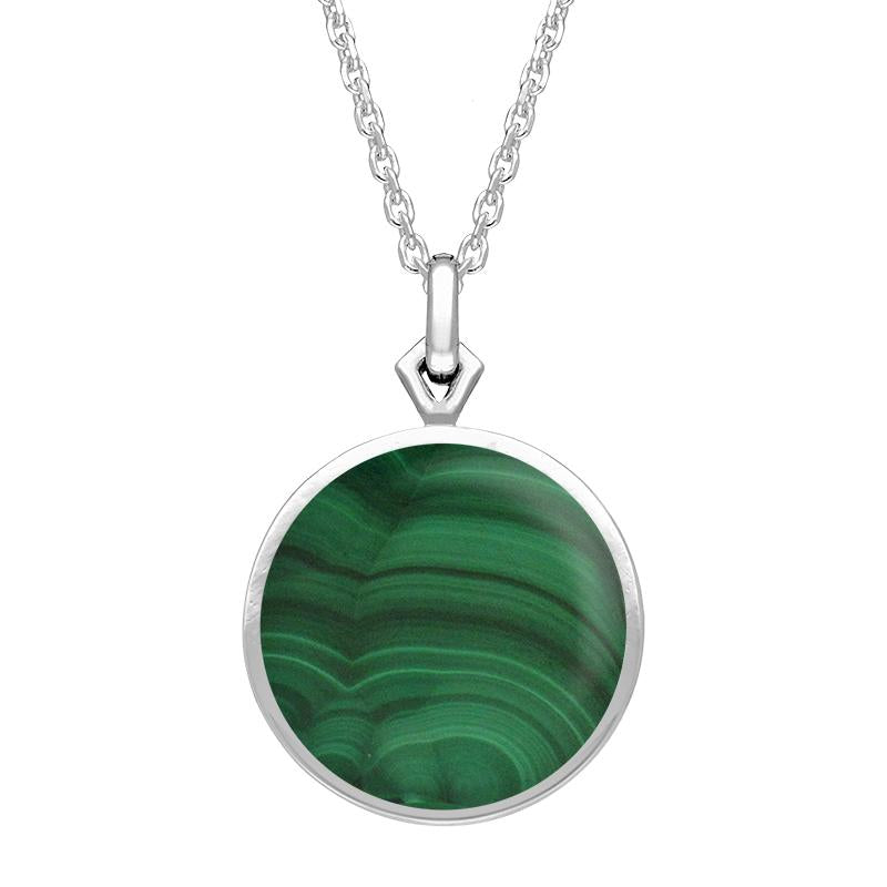 This beautiful necklace is part of Rebecca Sellors' Flore collection. The pendant is double-sided, and features a hand carved and polished cabochon of fine green Malachite. The gemstone is set in an intricately crafted sterling silver filigree design. Sold complete with an 18 inch sterling silver chain which fastens with a classic bolt ring style clasp.