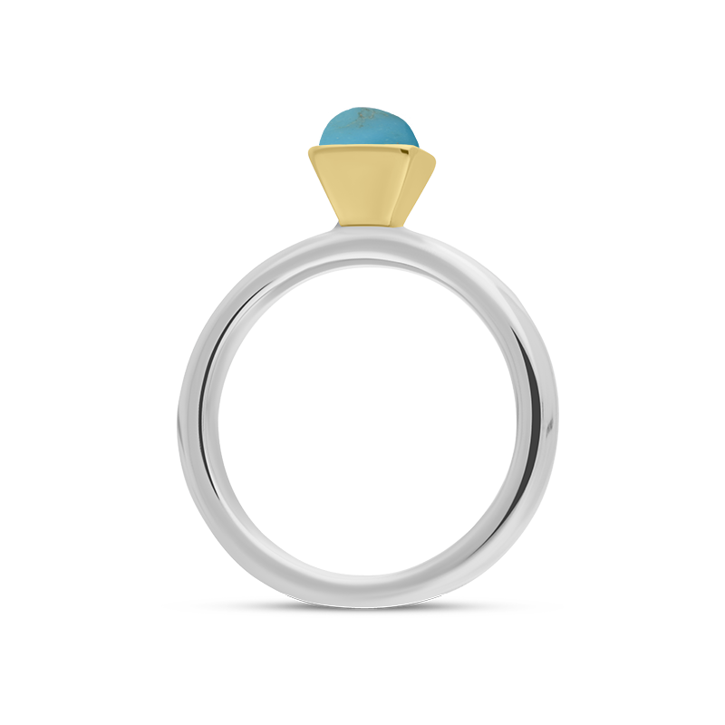 This ring features highly polished genuine Turquoise bezel set in 9ct yellow gold on a sterling silver shank.