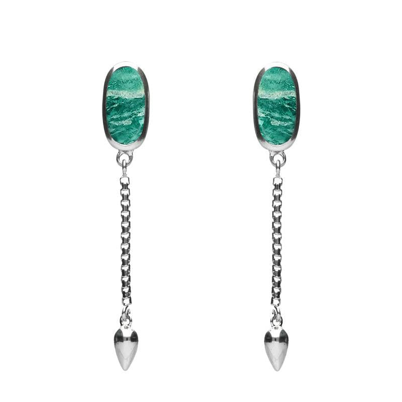 These elegant long drop stud earrings feature long, hand cut oval Amazonite gemstones framed in contemporary sterling silver settings. Fluid 20mm long chains flow from beneath the stones and they are finished with teardrop shaped sterling silver beads. The earrings are completed with classic post and butterfly studs.