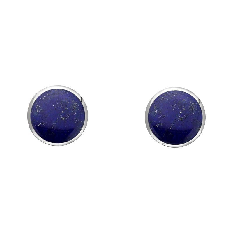 An embodiment of classic style, these sterling silver earrings feature two hand-carved circular cabochons of the finest Lapis Lazuli stone. The Lapis Lazuli is elegantly framed in sterling silver and the earrings are completed with secure post and butterfly fastenings, making them perfect for everyday wear.