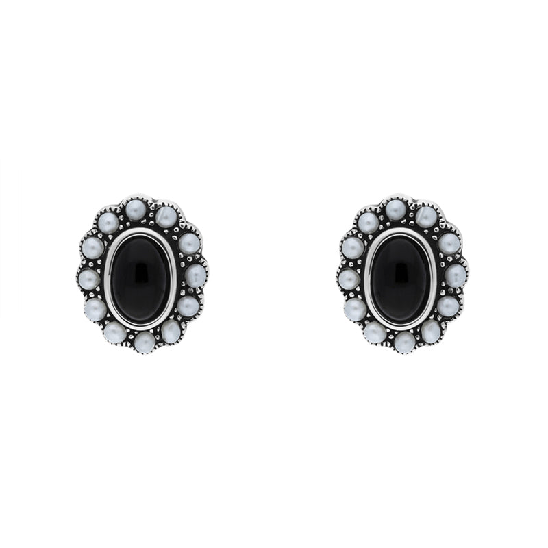 Sterling Silver Whitby Jet Pearl Oval Beaded Edge Stud Earrings