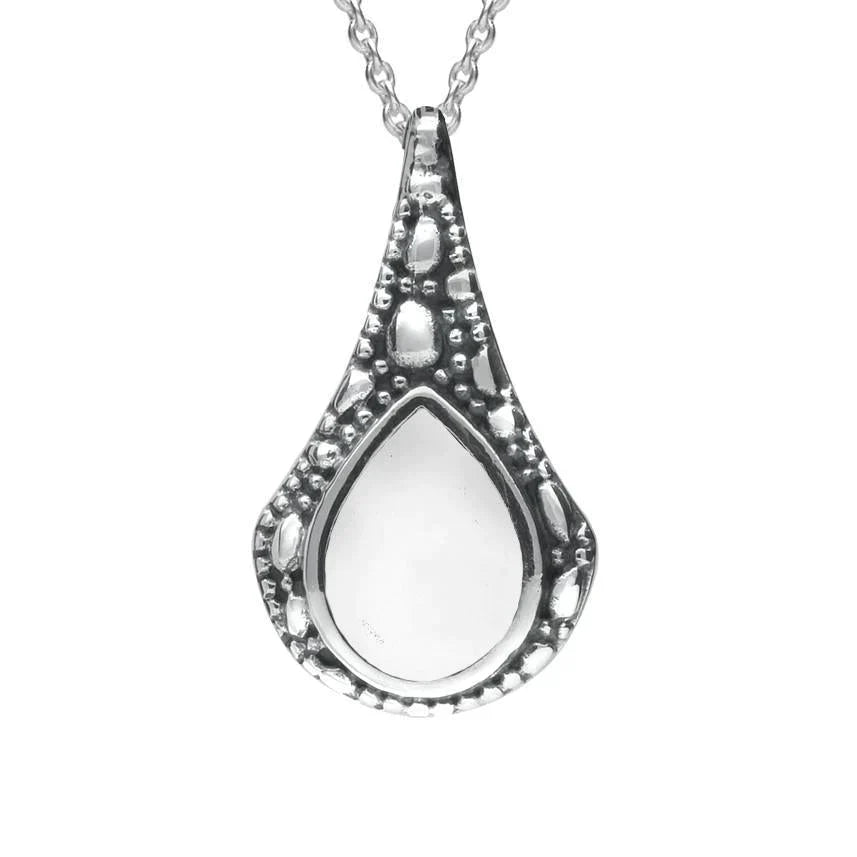 This hand crafted pendant by Shop Amber features a tear drop shaped Bauxite gemstone enclosed within a patterned frame of solid sterling silver. The pendant is supplied complete with an 18 inch silver chain.
