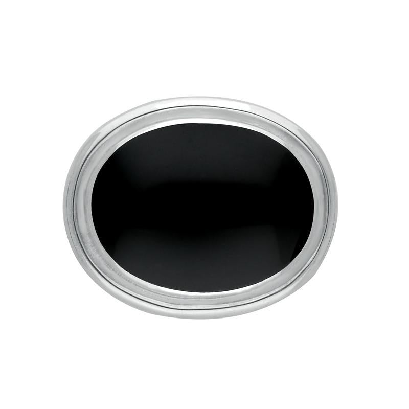 This classic brooch features a stunning oval shaped cabochon of the finest Whitby Jet stone, sourced directly from the North East coast of Yorkshire. The Jet is placed in a sterling silver double edged frame for a beautiful finish. The elegant sterling silver brooch is perfect for every occasion and fastens with a horizontal bar pin.