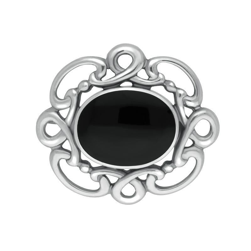 This exquisite brooch features a stunning oval shaped cabochon of the finest Whitby Jet stone, sourced directly from the North East coast of Yorkshire. The ornate sterling silver frame is beautifully entwined to create an intricate design. The brooch fastens with a horizontal bar pin.