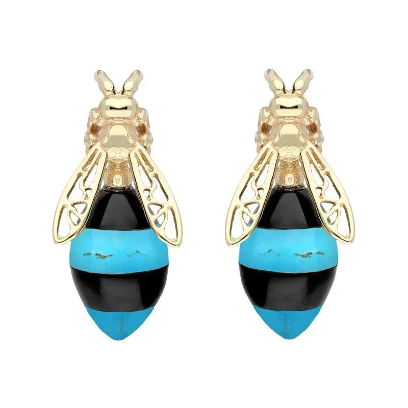 9ct Yellow Gold Whitby Jet Turquoise Bee Stud Earrings, E2424.