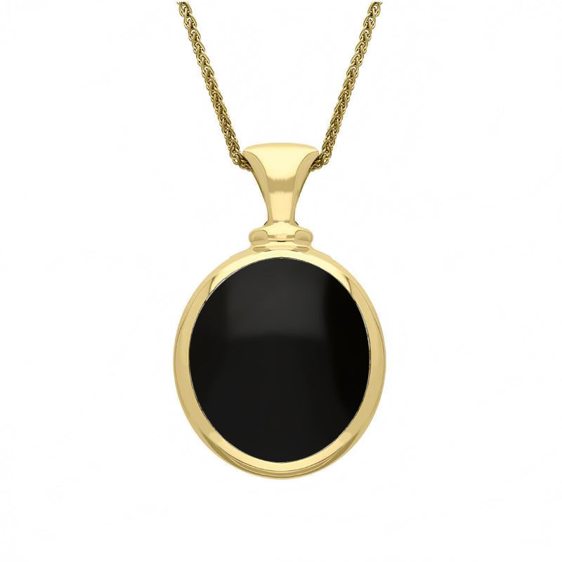 9ct Yellow Gold Whitby Jet Turquoise Small Double Sided Oval Fob Necklace, P219.