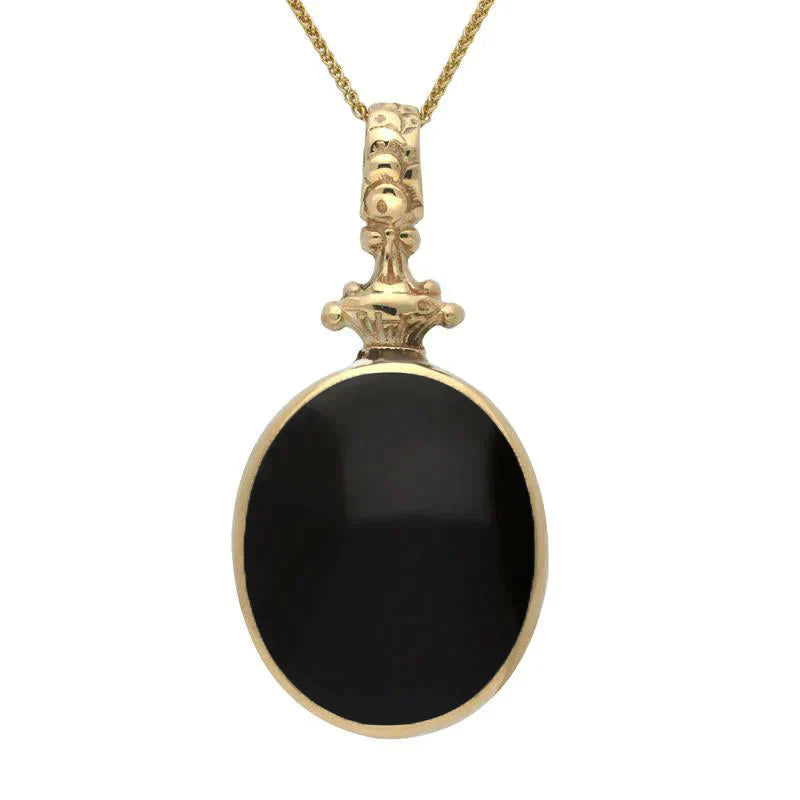 This classic double sided fob necklace is part of our Heritage handmade jewellery collection and features an oval locally sourced Whitby Jet gemstone on one side and an oval White Mother Of Pearl gemstone on the other. The stones are framed within a heavy highly polished 9ct Yellow Gold setting with a large ornate bail. This item is complete with an 18 inch yellow gold chain.