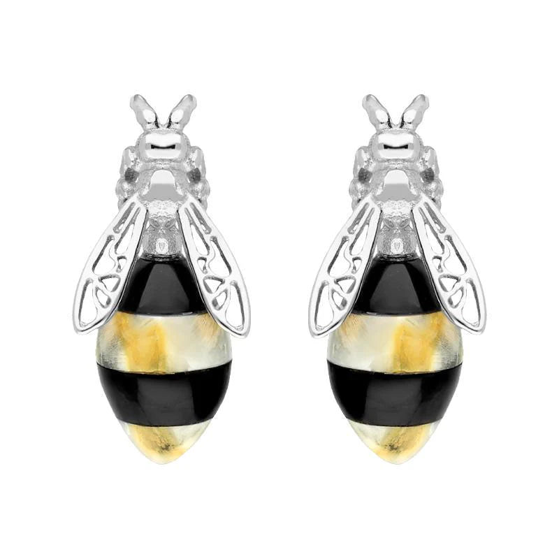 Sterling Silver Whitby Jet Amber Bee Stud Earrings, E2424.
