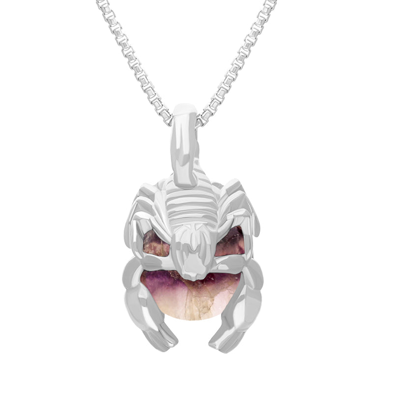 From the new Zodiac collection designed and handcrafted by Shop Amber, this unique star sign necklace is hand crafted in 18ct White Gold. It features a 9mm round highly polished Blue John bead which is held in place by the Scorpio star sign symbol. It is sold complete with an 18 inch 18ct White Gold chain. Scorpio birthdays fall between 23rd October to 21st November. This is the perfect addition to a jewellery collection that is unique as you are, or why not gift to your cosmically minded loved one.