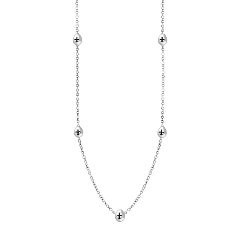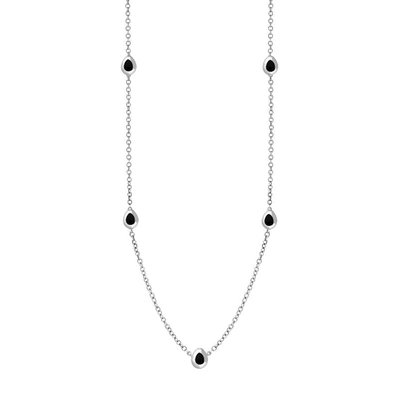 This on trend 18ct white gold chain necklace features petite discs embellished with Fleur De Lis shaped fine Whitby Jet stones that have been sourced directly from the North East coast of Yorkshire.