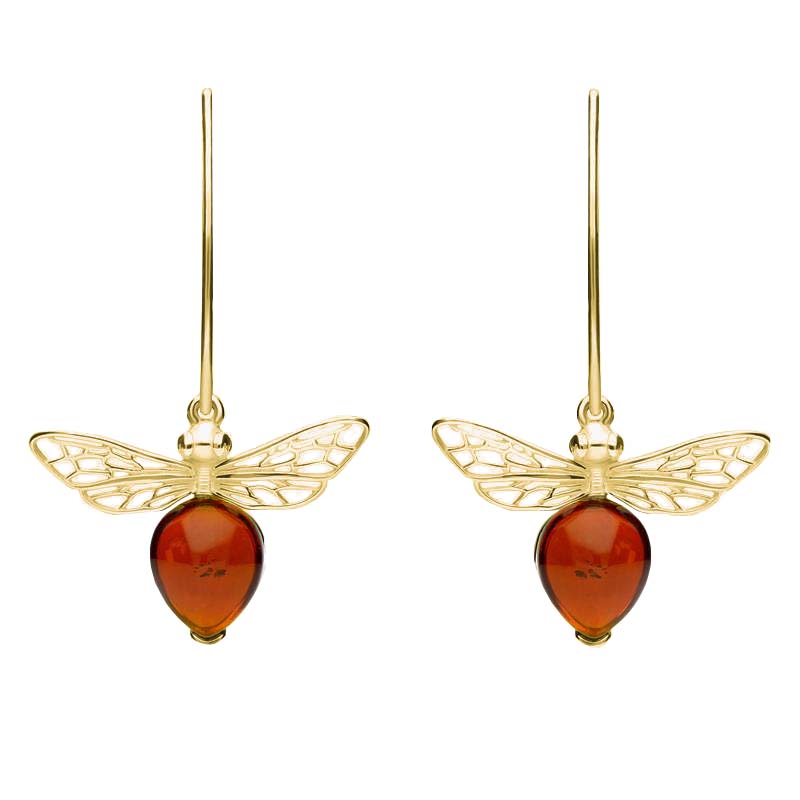These earrings are a fantastic display of Baltic Amber, fashioned into the shape of this delicate bee. These dainty hook earrings have intricate wings made of 9ct Yellow Gold that sit delicately above the body of the bee. Supplied with a 9ct Yellow Gold hook fastenings.