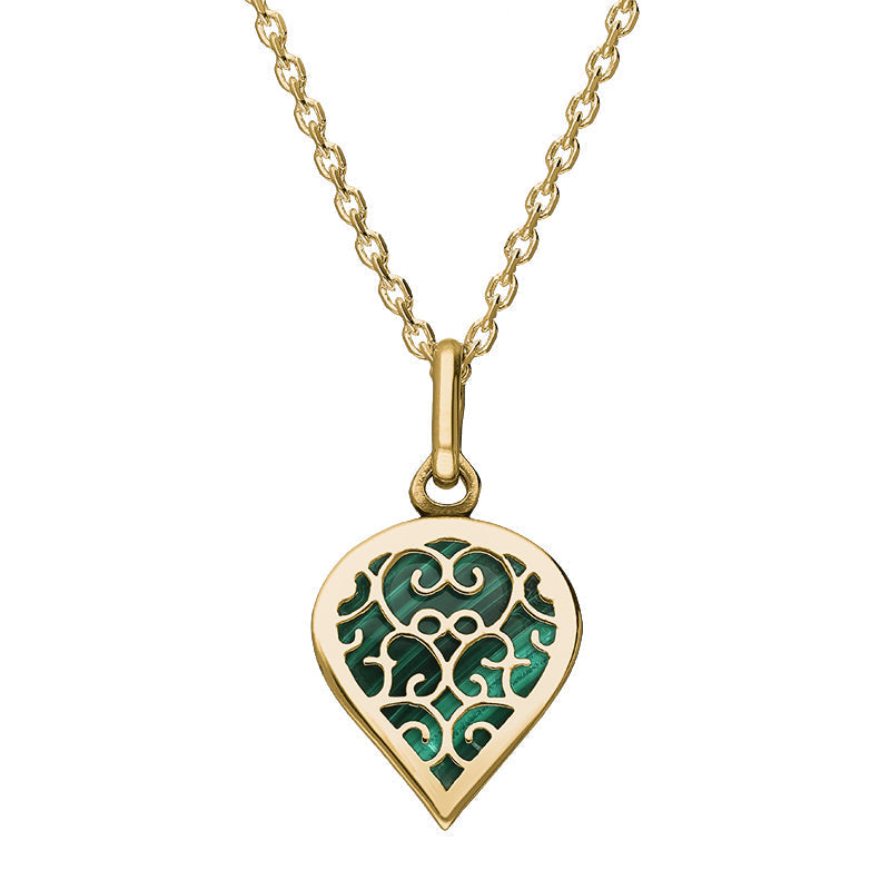 9ct Yellow Gold Malachite Flore Filigree Small Heart Necklace. P3629.