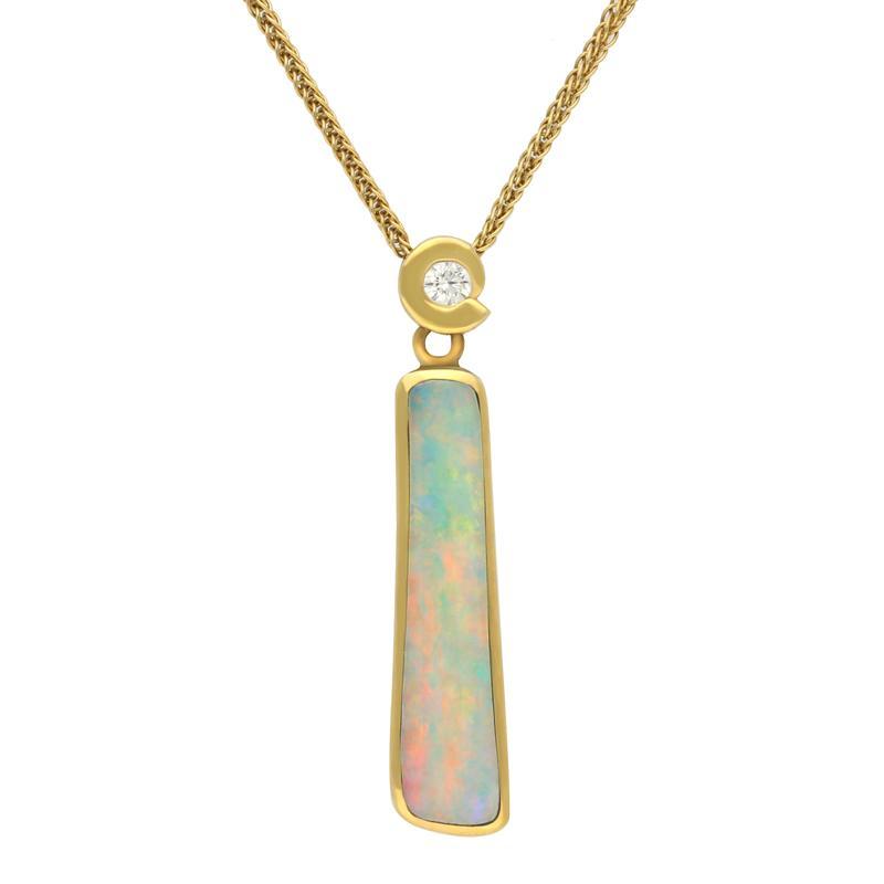 This gorgeous rectangular drop pendant features a brilliant cut 0.10ct diamond set within a solid 18ct yellow gold swirl shaped bail. Underneath the diamond gently hangs a rectangular hand carved 2.5ct Opal which is sourced from Mintabie in Australia. An 18 inch 18ct yellow gold chain completes this fabulous item.