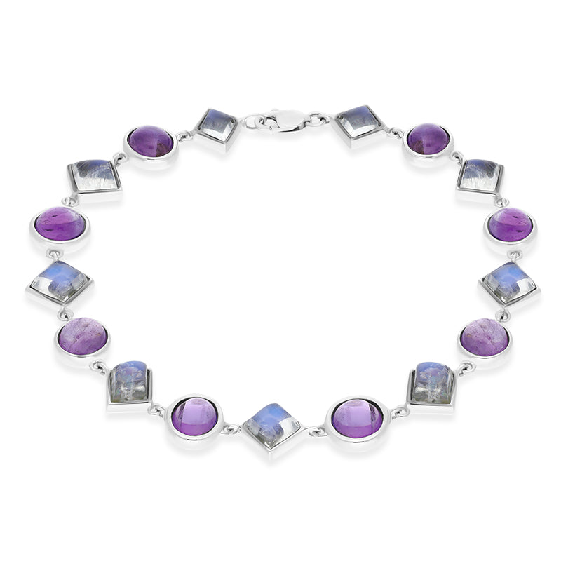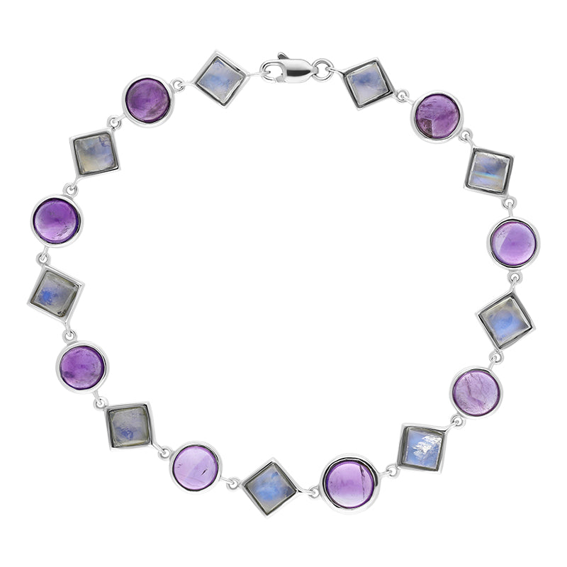 This unique bracelet features eight round shaped pieces of 8.19ct amethyst gemstones, alternated with nine modern square shaped Moonstone gemstones. The bracelet and gemstones are set in 9ct white gold. This striking, contemporary 9ct white gold bracelet is perfect for every occasion and is secured with a lobster-claw fastening for easy wear.