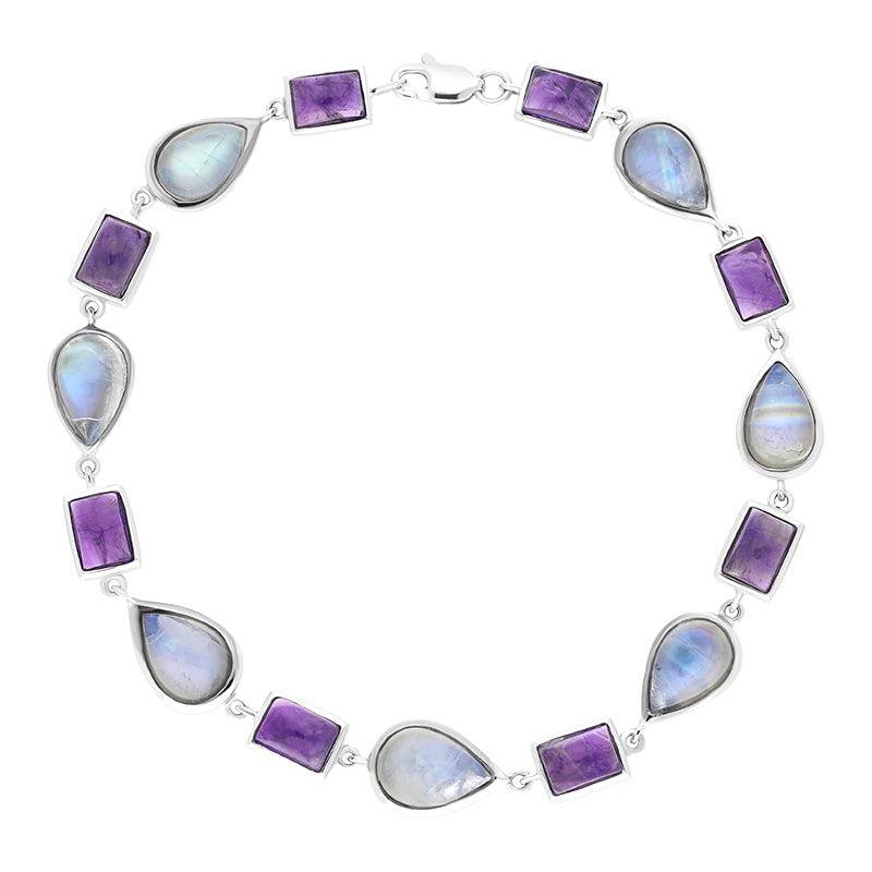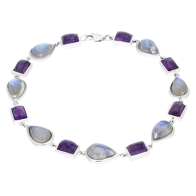 This unique bracelet features eight oblong shaped pieces of 7.22ct amethyst gemstones, alternated with nine modern pear shaped Moonstone gemstones. The bracelet and gemstones are set in 9ct white gold. This striking, contemporary 9ct white gold bracelet is perfect for every occasion and is secured with a lobster-claw fastening for easy wear.