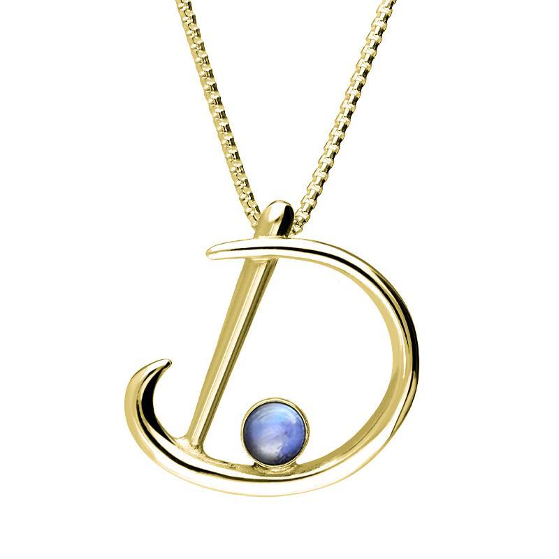 From the new 'Love Letters' collection designed and handcrafted in our very own workshop, this 9ct yellow gold necklace features an initial 'D' with a circular Moonstone. The pendant and stone hang elegantly from a 18 inch 9ct yellow gold chain.