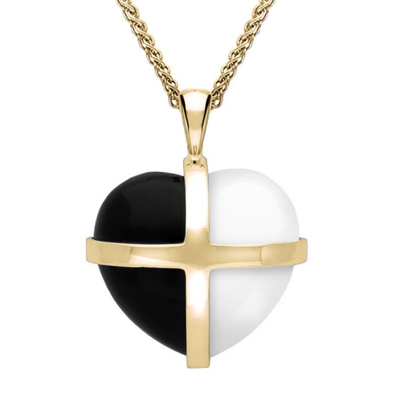 This elegant necklace is part of our Cross Heart collection and features a hand carved, heart shaped piece of fine white Bauxite and black Whitby Jet stone. The highly polished gemstones has been framed within a 9ct yellow gold mount that embraces the gemstones in a cross design. It sits gracefully on a 18" 9ct yellow gold chain completed by a classic bolt ring clasp for easy wear.