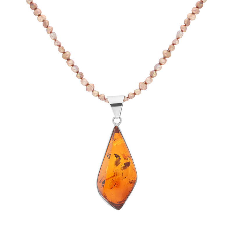 This charming necklace features the finest Baltic Amber and freshwater Pearl. The striking Baltic Amber creates a stunning contrast between the brown pearl and sterling silver making the perfect necklace for someone looking for a beautifully unique piece.